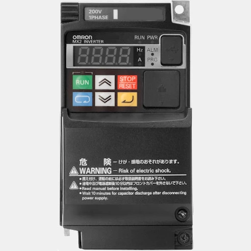 1-fazowy przetwornik Omron MX2 posiada: 7 wejść cyfrowych, 3 wejścia analogowe, 1 wyjście przekaźnikowe, 3 wyjścia binarne oraz 2 wyjście analogowe. Komunikacja w tym modelu odbywa się protokołem Modbus po RS485.