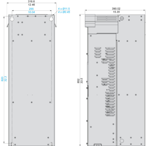 Falownik ATV610C11N4 Schneider Electric przeznaczony do pracy z trójfazowymi silnikami asynchronicznymi o mocy do 110 kW. Przetwornik zasilany jest napięciem 3x380...460 VAC. Moc przemiennika ATV610C11N4 przy pracy ciężkiej wynosi 90kW, zaś przy pracy lekkiej to 110 kW. Prąd wejściowy tego inwertera to odpowiednio 201 A ND/170 A HD, zaś prąd wyjściowy 211 ND i 173 HD. Częstotliwość wyjściowa podana jest na 500 Hz, a znamionowa częstotliwość łączeniowa 4000 Hz. Komunikacja w falowniku Easy Altivar 610 odbywa się protokołem Modbus RTU po RS485. 3-fazowy falownik ATV610C11N4 został wyposażony w 6 wejść cyfrowych, 3 wyjścia przekaźnikowe, 3 wejścia analogowe prądowo-napięciowe oraz 1 wyjście analogowe prądowe i 1 wyjście analogowe napięciowe, z możliwości rozbudowy za pomocą kart rozszerzeń I/O. Schneider Electric zaleca stosowanie przy ATV610 ATV610C11N4 wyłącznika silnikowego NSX250-MA220 filtr du/dt VW3A5307 oraz zabezpieczenia 315A. Ponadto przetwornik został wyposażony w zabudowany filtr EMC C3. Dodatkowo Schneider Electric daje możliwość rozbudowy falownika za pomocą kart rozszerzeń. W przypadku przetwornika ATV610C11N4 dostępne są: karty rozszerzeń wejść/wyjść VW3A3203, VW3A3204 oraz karta komunikacyjna ProfibusDP VW3A3607. Falownik ATV610C11N4 posiada obudowę o stopniu ochrony IP20 przystosowany a do montażu pionowego. Wymiary urządzenia to 850x300x375 mm, waga wynosi 85,5 kg.