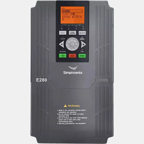 3-fazowy falownik wektorowy E280-4T0150G/4T0185P marki Simphoenix przeznaczony do pracy z silnikami trójfazowymi. Inwerter E280-4T0150G/4T0185P o mocy 15 kW HD/18,5 kW LD i prądzie wyjściowym 32/37 A. Napięcie zasilania przemiennika częstotliwości E280 Simphoenix mieści się w przedziale 323...437 VAC, a jego częstotliwość wynosi 50/60 Hz. Wektorowy przemiennik E280-4T0150G/4T0185P został wyposażony w: 5 wejść cyfrowych, 1 wejście analogowe napięciowe, jedno wejście analogowe prądowe, jedno wyjście cyfrowe, jedno wyjście przekaźnikowe, jedno wyjście analogowe prądowo-napięciowe. Urządzenie sterowane jest protokołem Modbus przez złącza RS485. E280 charakteryzują się częstotliwością wyjściową przy niskim zakresie pracy do 300 Hz, a wysokim zakresie do 400 Hz. Trójfazowy falownik 15 kW E280 Simphoenix posiada wbudowany moduł hamowania, co pozwala na bezpośrednie podłączenie rezystora hamowania o mocy 3600W i rezystencji 35 Ohm. Producent zaleca stosowanie w tym modelu filtra EMC NFI-036. Dodatkowo wektorowy przemiennik E280-4T0150G/4T0185P dysponuje regulatorem PID, dwoma wewnętrznymi licznikami i trzema timerami. Przykładem zastosowań przetworników E280 są: wciągarki, suwnice, transportery, frezarki, obrabiarki wrzecionowe, oraz maszyny do grawerowania. W przypadku E280-4T0150G/4T0185P zaleca się korzystanie z przewodu o przekroju 10mm2.