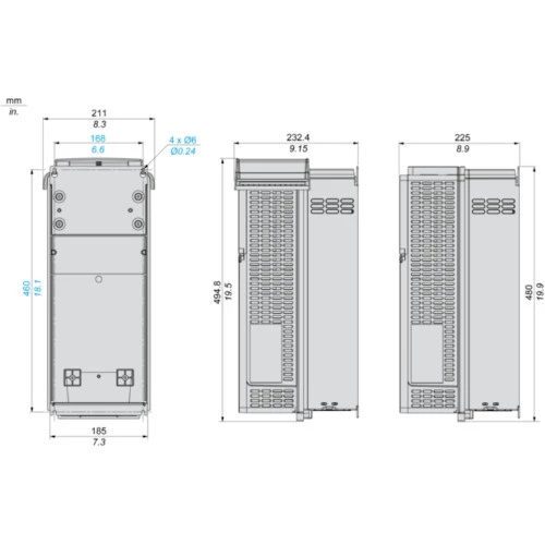 Falownik ATV610D22N4 Schneider Electric przeznaczony do pracy z trójfazowymi silnikami asynchronicznymi o mocy do 22 kW. Przetwornik zasilany jest napięciem 3x380...460 VAC. Moc przemiennika ATV610D22N4 przy pracy ciężkiej wynosi 18,5kW, zaś przy pracy lekkiej to 22 kW. Prąd wejściowy tego inwertera to odpowiednio 41,9 A ND/36 A HD, zaś prąd wyjściowy 46,3A ND i 39,2 HD. Częstotliwość wyjściowa podana jest na 500 Hz, a znamionowa częstotliwość łączeniowa 4000 Hz. Komunikacja w falowniku Easy Altivar 610 odbywa się protokołem Modbus RTU po RS485. 3-fazowy falownik ATV610D22N4 został wyposażony w 6 wejść cyfrowych, 3 wyjścia przekaźnikowe, 3 wejścia analogowe prądowo-napięciowe oraz 1 wyjście analogowe prądowe i 1 wyjście analogowe napięciowe, z możliwości rozbudowy za pomocą kart rozszerzeń I/O. Schneider Electric zaleca stosowanie przy ATV610 ATV610D22N4 wyłącznika silnikowego GV3L40 filtr du/dt VW3A5304 oraz zabezpieczenia 80A. Ponadto przetwornik został wyposażony w zabudowany filtr EMC C3. Dodatkowo Schneider Electric daje możliwość rozbudowy falownika za pomocą kart rozszerzeń. W przypadku przetwornika ATV610D22N4 dostępne są: karty rozszerzeń wejść/wyjść VW3A3203, VW3A3204 oraz karta komunikacyjna ProfibusDP VW3A3607. Falownik ATV610D22N4 posiada obudowę o stopniu ochrony IP20 przystosowany a do montażu pionowego. Wymiary urządzenia to 495x211x232 mm, waga wynosi 13,5 kg.