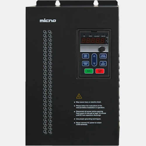 Trójfazowy falownik KE600A-037G-T4 marki Micno o mocy 37 kW i zasilaniu 3x 400 VAC o częstotliwości 47...63Hz. Falownik dedykowany jest do pracy z trójfazowymi silnikami asynchronicznymi i synchronicznymi. Prąd wejściowy urządzenia oscyluje wokół 76 A, natomiast prąd wyjściowy 75A. Falownik Micno KE600 37 kW został wyposażony w: 7 wejść cyfrowych w tym jedno szybkie, 2 wejścia analogowe prądowo-napięciowe, 1 programowalne wyjście tranzystorowe, 1 programowalne wyjście przekaźnikowe oraz 2 wyjścia analogowe prądowo-napięciowe. Ponadto przetwornik można rozbudować o dodatkowe czy punkty wejść. 3-fazowy przemiennik KE600A-037G dysponuje wbudowanym portem szeregowym RS-488 z obsługą protokołu Modbus RTU. Częstotliwość wyjściowa falownika Micno KE600A przy sterowaniu skalarnym wynosi 0...3000 Hz, a przy sterowaniu wektorowym 0...300 Hz. Dodatkowo inverter KE600A 37 kW posiada wbudowany sterownik PLC 16 kroków. Falownik KE600A-037G-T4 został przystosowany do pracy w temperaturze od -10 do +60 stopni Celsjusza, z kolei temperaturę przechowywania producent podaje na -20...60 stopni Celsjusza. Wymiary urządzenia wynoszą 600 x 320 x 330 mm. Wymiary montażowe dla tego modelu to: 230x582mm.
