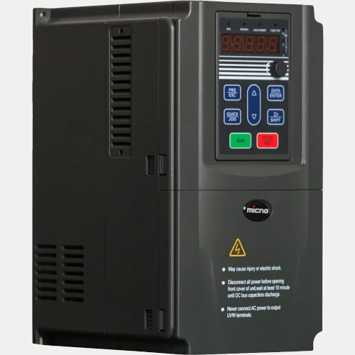 Trójfazowy falownik KE600A-5R5G-T4 marki Micno o mocy 5,5 kW i zasilaniu 3x 400 VAC o częstotliwości 47...63Hz. Falownik dedykowany jest do pracy z trójfazowymi silnikami asynchronicznymi i synchronicznymi. Prąd wejściowy urządzenia oscyluje wokół 15 A, natomiast prąd wyjściowy 13A. Falownik Micno KE600 5,5 kW został wyposażony w: 7 wejść cyfrowych w tym jedno szybkie, 2 wejścia analogowe prądowo-napięciowe, 1 programowalne wyjście tranzystorowe, 1 programowalne wyjście przekaźnikowe oraz 2 wyjścia analogowe prądowo-napięciowe. Ponadto przetwornik można rozbudować o dodatkowe czy punkty wejść. 3-fazowy przemiennik KE600A-5R5GA dysponuje wbudowanym portem szeregowym RS-488 z obsługą protokołu Modbus RTU. Częstotliwość wyjściowa falownika Micno KE600A przy sterowaniu skalarnym wynosi 0...3000 Hz, a przy sterowaniu wektorowym 0...300 Hz. Dodatkowo inverter KE600A 5,5 kW posiada wbudowany sterownik PLC 16 kroków. Falownik KE600A-5R5G-T4 został przystosowany do pracy w temperaturze od -10 do +60 stopni Celsjusza, z kolei temperaturę przechowywania producent podaje na -20...60 stopni Celsjusza. Wymiary urządzenia wynoszą 314 x 170 x 167 mm. Wymiary montażowe dla tego modelu to: 90x301,6mm.