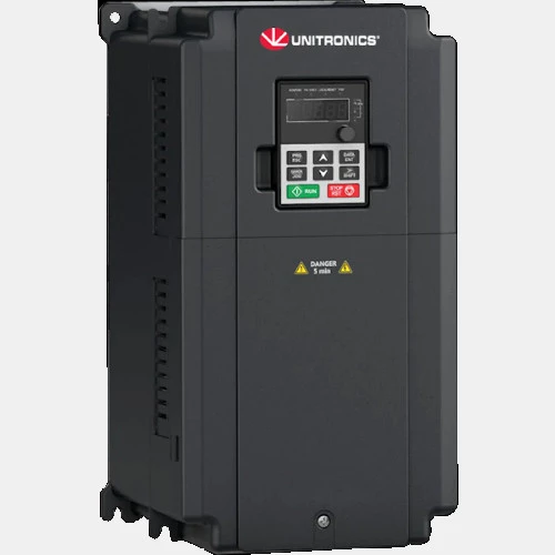 3-fazowy falownik UMI-0075EE-B1 marki Unitronics o mocy 7,5kW dedykowany do współpracy z 3-fazowymi silnikami asynchronicznymi. Przetwornik zasilany jest napięciem 3x400 VAC o częstotliwości 50/60Hz, natomiast częstotliwość wyjściowa mieści się w przedziale 0...400 Hz. Inverter UMI-B1 sterowany jest zarówno w sposób skalarny, jak i wektorowy. Prąd wejściowy falownika UMI-0075EE-B1 wynosi 25 A, a prąd wyjściowy 18,5A. Producent deklaruje przeciążalność falownika na poziomie 150%/60s, 180%/10s oraz 200%/1s. Falownik Unitronics UMI-B1 został wyposażony w 4 wejścia cyfrowe 1kHz, 1 wejście cyfrowe 50kHz, 1 wejście analogowe prądowo-napięciowe, 1 wejście napięciowe, 1 wyjście tranzystorowe, 2 wyjście przekaźnikowe oraz 2 wyjście analogowe prądowo-napięciowe. Dodatkowo ten model został wyposażony w zabudowane wejście bezpieczeństwa STO. Komunikacja odbywa się protokołem Modbus RTU po RS485.
