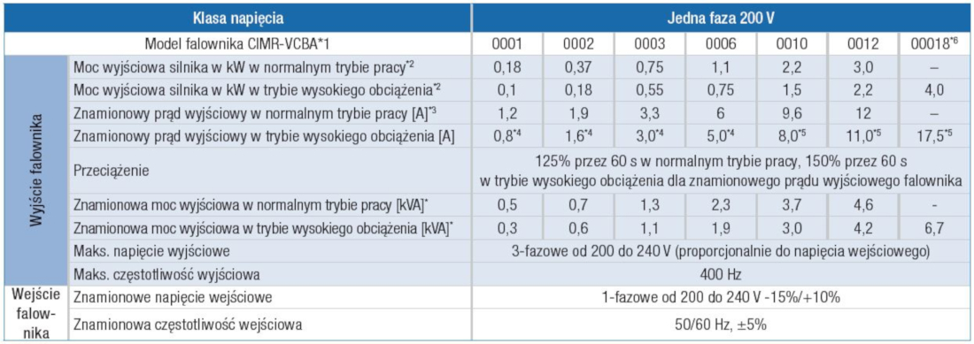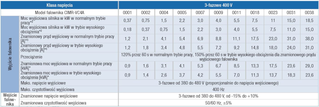 Grupa V1000 Yaskawa oferuje falownik 1-fazowy o zakresie mocy 0,37 - 4 kW, natomiast falownik 3-fazowy występuję o przedziale mocy 0,4 – 15kW. Poniżej specyfikacja dostępnych modeli V1000 oraz specyfikacja połączeń falowników V1000.