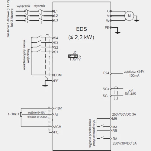 Falownik EDS0015T4B-C Elmatic dedykowany jest do pracy z trójfazowym silnikiem asynchronicznym o mocy do 1,5 kW. Inverter EDS0015T4B-C o mocy 1,5 kW i napiciu zasilania 3x400 VAC. Skalarny przetwornik EDS 1,5 kW Elmatic charakteryzuje się prądem wyjściowym na poziomie 4A i częstotliwością wyjściową 400Hz. Producent deklaruje możliwość pracy invertera przy przeciążeniu 150% w czasie 1 minuty. W standardzie falownik Elmatic EDS został wyposażony w 4 wejścia cyfrowe, 1 wejście analogowe prądowo-napięciowe oraz 2 wyjścia przekaźnikowe. Komunikacja w tym przemienniku odbywa się protokołem Modbus RTU/ASCII po RS485. Dodatkowo trójfazowy falownik EDS0015T4B-C dysponuje funkcją Energy saving oraz funkcją lotnego startu. Obudowa falownika EDS0015T4B-C posiada stopień ochrony IP65 i jest przystosowana zarówno do montażu naściennego, jak i bezpośrednio na silniku. Przemiennik częstotliwości EDS0015T4B-C polecany jest szczególnie do aplikacji wentylatorowych oraz pompowych.