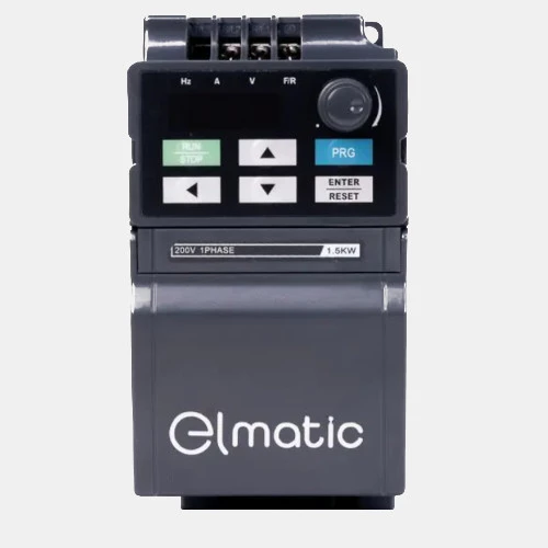 Falownik ED2200-01R5G-C Elmatic dedykowany do współpracy z trójfazowymi asynchronicznymi silnikami indukcyjnymi o mocy 1,5 kW. Przemiennik częstotliwości 1,5 kW ED2000 zasilany jest napięciem 1x230 VAC o częstotliwości 50-60 Hz. Producent podaje częstotliwość wyjściową na poziomie 0,1...320 Hz. Prąd wejściowy tego przetwornika szacowany jest na poziomie 10A, natomiast prąd wyjściowy oscyluje wokół 7A. Inverter ED2200-01R5G-C dysponuje następującymi trybami sterowania: bezczujnikowe, wektorowe, skalarne U/f. Falownik Elmatic ED2200-01R5G-C został wyposażony w prosty PLC, posiada 6 wejść binarnych w tym 1 szybkie 100 kHz, 1 wejście analogowe prądowo-napięciowe, 1 wyjście cyfrowe, 1 wyjście przekaźnikowe oraz 1 wyjście analogowe prądowo-napięciowe. Przemiennik posiada również wbudowany filtr EMC. Komunikacja w tym przetworniku odbywa się protokołem Modbus RTU po RS485. Producent zaleca stosowanie rezystora hamowania o mocy 100 W i rezystancji 100 Ohm. W przypadku 1-fazowego falownika ED2200-01R5G-C Elmatic proponuje wykorzystanie stycznika 18A, różnicówkę 25 A oraz przewód o przekroju 1,5mm2. Obudowa przetwornika ED2200-01R5G-C została wykonana z tworzywa i cechuje się stopniem ochrony IP20 oraz montażem naściennym. Wymiary 1-fazowego falownika 1,5 kW ED2000 wynoszą 72x142x152 mm.