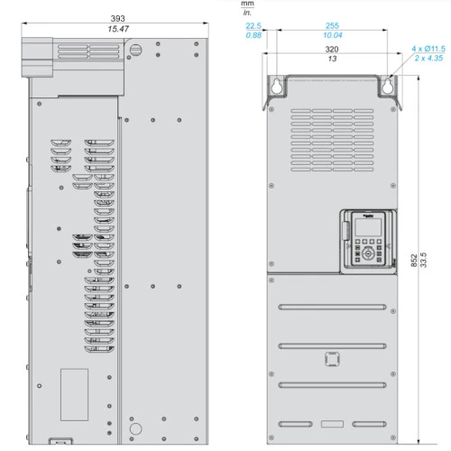 Falownik Altivar Process ATV930C11N4C Schneider Electric przeznaczony do pracy z trójfazowymi silnikami asynchronicznymi i synchronicznymi. 3-fazowy falownik ATV930C11N4C o mocy 110 kW przy obciążeniu lekkim i 90 kW przy obciążeniu ciężkim. Prąd wyjściowy wynosi odpowiednio 211 A przy lekkim obciążeniu i 173A przy obciążeniu ciężkim. Częstotliwość wyjściowa dla falownika Altivar Process ATV900 wynosi 599 Hz. Inwerter ATV930C11N4C dysponuje 10 wejściami binarnymi, 2 wyjściami binarnymi, 3 wejściami analogowymi, 2 wyjściami analogowymi oraz 3 wyjściami przekaźnikowymi. Ponadto ATV900 dysponuje wejściem bezpieczeństwa STO. Komunikacja w falowniku ATV930C11N4C odbywa się protokołem Ethernet/IP i Modbus TCP. Przemiennik częstotliwości w wersji standardowej ATV930C11N4C został wyposażony w filtr EMC. Falownik ATV930C11N4C posiada obudowę przystosowaną do montażu naściennego pionowego i stopniu ochrony IP21. Wymiary falownika ATV930 90kW wynoszą: 320 x 852 x 393 mm i wadze 82 kg.