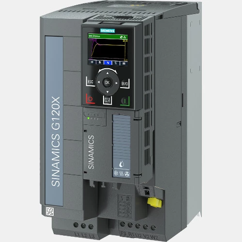 3-fazowy falownik6SL3220-2YE26-0AB0 produkcji Siemens z filtrem C2 o mocy 11 kW. Sinamics G120X 6SL3220-2YE26-0AB0 zasilany jest napięciem mieszczącym się w przedziale 342...528V AC o częstotliwości 47...63 Hz. Pobór prądu przemiennika częstotliwości wynosi 24,5 A, zaś prąd wyjściowy 26 A. Wektorowy falownik Sinamics G120X wyposażony jest w: 6 wejść cyfrowych, 2 wejścia analogowe prądowo-napięciowe, 1 wejście temperaturowe, 2 wyjścia przekaźnikowe oraz 1 wyjście analogowe. Falownik 6SL3220-2YE26-0AB0 z panelem operatorskim BOP-2 i bez modułu I/O dysponuje komunikacją Ethernet oraz Modbus RTU/USS. Wymiary falownika Siemens to: 295 x 140 x 218 mm. Waga urządzenia wynosi 8,8kg.
