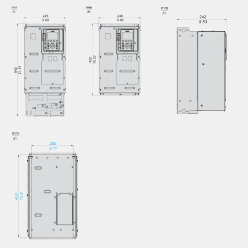 Falownik ATV630D11Y6 Schneider Electric dedykowany do współpracy z trójfazowymi silnikami o obciążeniu do 13,5A. Przemiennik częstotliwości ATV630D11Y6 o mocy 11kW przy obciążaniu lekkim oraz 7,5 kW przy obciążeniu ciężkim współpracuje zarówno w silnikami asynchronicznymi jaki i synchronicznymi. Przetwornik ATV630 w wykonaniu standardowym zasilany jest napięciem 500...690 VAC o częstotliwości 47,5...63 Hz. Prąd wyjściowy falownika ATV630D11Y6 wynosi odpowiednio 13,5A ND oraz 9,5 HD, zaś częstotliwość wyjściowa 500Hz. Komunikacja w falowniku ATV600 Schneider odbywa się po: Modbus TCP, Ethernet lub Modbus szeregowy. 3-fazowy falownik ATV600 ATV630D11Y6 dysponuje 8 wejściami binarnymi, 3 wejściami analogowymi, 2 wyjściami analogowymi oraz 3 wyjściami przekaźnikowymi. Dodatkowo dysponuje wejściem bezpieczeństwa STO. Kompaktowa obudowa o stopniu ochrony IP50 przystosowana jest do montażu naściennego. Wymiary przetwornika ATV630D11Y6 wynoszą: 246x420x242 mm, a jego waga to 22kg.