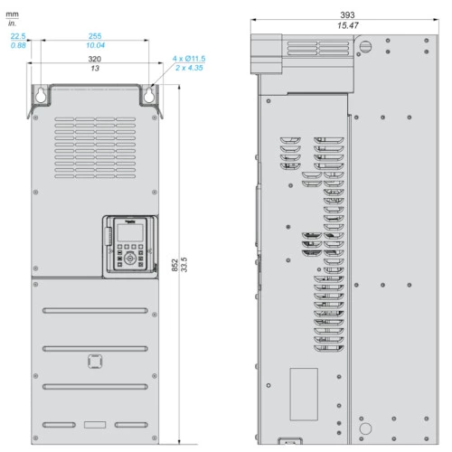Falownik Altivar Process ATV930C13N4C Schneider Electric przeznaczony do pracy z trójfazowymi silnikami asynchronicznymi i synchronicznymi. 3-fazowy falownik ATV930C13N4C o mocy 132 kW przy obciążeniu lekkim i 110 kW przy obciążeniu ciężkim. Prąd wyjściowy wynosi odpowiednio 250 A przy lekkim obciążeniu i 211A przy obciążeniu ciężkim. Częstotliwość wyjściowa dla falownika Altivar Process ATV900 wynosi 599 Hz. Inwerter ATV930C13N4C dysponuje 10 wejściami binarnymi, 2 wyjściami binarnymi, 3 wejściami analogowymi, 2 wyjściami analogowymi oraz 3 wyjściami przekaźnikowymi. Ponadto ATV900 dysponuje wejściem bezpieczeństwa STO. Komunikacja w falowniku ATV930C13N4C odbywa się protokołem Ethernet/IP i Modbus TCP. Przemiennik częstotliwości w wersji standardowej ATV930C13N4C został wyposażony w filtr EMC. Falownik ATV930C13N4C posiada obudowę przystosowaną do montażu naściennego pionowego i stopniu ochrony IP21. Wymiary falownika ATV930 132kW wynoszą: 320 x 852 x 393 mm i wadze 82 kg.