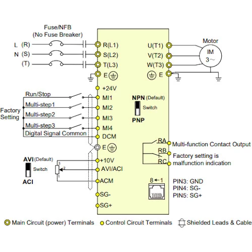 Falownik VFD022EL21W-1 Delta Electronics przeznaczony do pracy z silnikami trójfazowymi o mocy do 2,2kW. Przemiennik zasilany jest napięciem 1x230VAC. Częstotliwość napięcia zasilającego wynosi 50/60 Hz. Jednofazowy falownik o mocy 2,2 kW i prądzie wyjściowym 11A. Częstotliwość wyjściowa przetwornika VFD-EL-W szacowana jest na poziomie 400Hz. Producent deklaruje możliwość pracy przemiennika częstotliwości VFD022EL21W-1 w przeciążeniu 150% w czasie 60sekund. Falownik VFD-EL-W został wyposażony w 4 wejścia binarne oraz 1 wyjście cyfrowe. Komunikacja odbywa się protokołem Modbus po RS485. Obudowa falownika 2,2kW VFD-EL-W charakteryzuje się stopniem ochrony IP20 a jej wymiary wynoszą: 162x92x128,7. Waga urządzenia to 1kg.