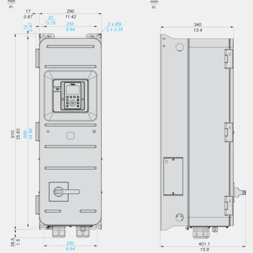Falownik ATV650D37N4E Schneider Electric dedykowany do współpracy z trójfazowymi silnikami o obciążeniu do 59A. Przemiennik częstotliwości ATV650D37N4E o mocy 30kW przy obciążaniu lekkim oraz 37 kW przy obciążeniu ciężkim współpracuje zarówno w silnikami asynchronicznymi jaki i synchronicznymi. Przetwornik ATV650 w wykonaniu z odłącznikiem zasilany jest napięciem 380...480 VAC o częstotliwości 47,5...63 Hz. Prąd wyjściowy falownika ATV650D37N4E wynosi odpowiednio 59A ND oraz 72 HD, zaś częstotliwość wyjściowa 500Hz. Komunikacja w falowniku ATV600 Schneider odbywa się po: Modbus TCP, Ethernet x2. 3-fazowy falownik ATV600 ATV650D37N4E dysponuje 8 wejściami binarnymi, 3 wejściami analogowymi, 2 wyjściami analogowymi oraz 3 wyjściami przekaźnikowymi. Dodatkowo dysponuje wejściem bezpieczeństwa STO. Kompaktowa obudowa o stopniu ochrony IP55 przystosowana jest do montażu naściennego. Wymiary przetwornika ATV650D37N4E wynoszą: 290x910x401 mm, a jego waga to 50kg.