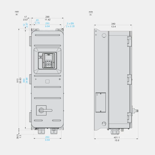 Falownik ATV650D45N4E Schneider Electric dedykowany do współpracy z trójfazowymi silnikami o obciążeniu do 72A. Przemiennik częstotliwości ATV650D45N4E o mocy 37kW przy obciążaniu lekkim oraz 45 kW przy obciążeniu ciężkim współpracuje zarówno w silnikami asynchronicznymi jaki i synchronicznymi. Przetwornik ATV650 w wykonaniu z odłącznikiem zasilany jest napięciem 380...480 VAC o częstotliwości 47,5...63 Hz. Prąd wyjściowy falownika ATV650D45N4E wynosi odpowiednio 72A ND oraz 87 HD, zaś częstotliwość wyjściowa 500Hz. Komunikacja w falowniku ATV600 Schneider odbywa się po: Modbus TCP, Ethernet lub Modbus szeregowy. 3-fazowy falownik ATV600 ATV650D45N4E dysponuje 8 wejściami binarnymi, 3 wejściami analogowymi, 2 wyjściami analogowymi oraz 3 wyjściami przekaźnikowymi. Dodatkowo dysponuje wejściem bezpieczeństwa STO. Kompaktowa obudowa o stopniu ochrony IP55 przystosowana jest do montażu naściennego. Wymiary przetwornika ATV650D45N4E wynoszą: 290x910x401 mm, a jego waga to 50kg.