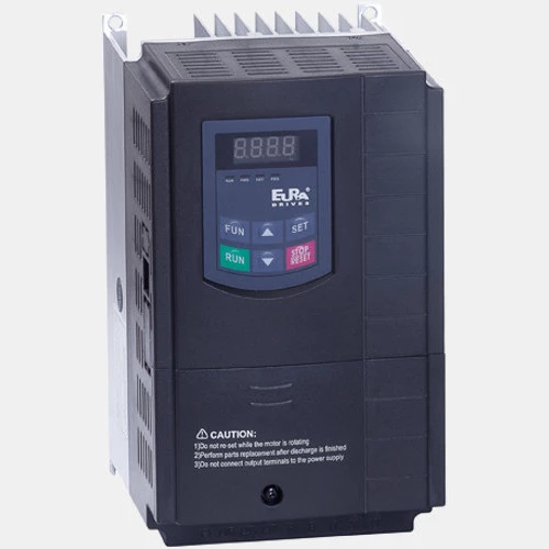 Falownik E2200-0040T3 Eura Drives o mocy 4 kW przeznaczony do pracy z trójfazowymi silnikami asynchronicznymi i synchronicznymi PMSM. Napięcie zasilania wynosi 198...264 V AC. Częstotliwość napięcia zasilania wynosi 47,5...63Hz. Wektorowy falownik E2200-0040T3 o deklarowanej sprawności na poziomie 94% został wyposażony w 6 wejść cyfrowych, 2 wejścia analogowe, 1 wyjście cyfrowe, 1 wyjście przekaźnikowe oraz 2 wyjścia analogowe. Komunikacja w falownikach E2200 wersji F5 odbywa się po EtherCAT lub Modbus. Częstotliwość wyjściowa dla falowników serii E2200 wynosi 0...590 Hz. Prąd wyjściowy dla wektorowego falownika 4 kW E2200 Eura wynosi 9 A. Przemiennik częstotliwości E2200-0040T3 w wersji F5 został wyposażony w moduł hamowania co pozwala na bezpośrednie podłączenie rezystora hamowania o mocy 1500W i 90 Ohm. Producent zaleca stosowanie zabezpieczenia nadprądowego B6. Trójfazowy falownik 4 kW E2200 posiada kompaktową obudowę z tworzywa wyposażoną w filtr sieciowy. Wymiary falownik E2200-0040T3 wynoszą: 106x150x180 mm, zaś jego waga wynosi 2,1 kg. Wymiary montażowe natomiast wynoszą: 94x170 mm, śruby montażowe M4. System chłodzenia w przypadku tego modelu jest wymuszony.