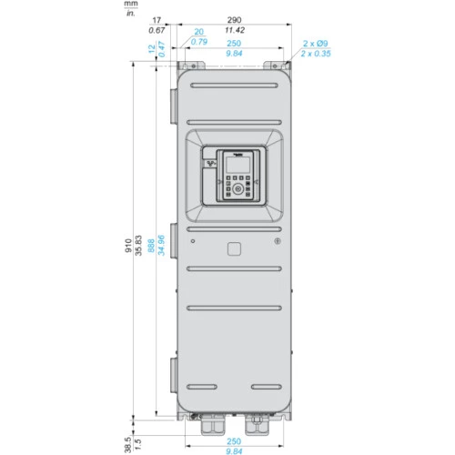 Falownik Altivar Process ATV950D45N4 Schneider Electric przeznaczony do pracy z trójfazowymi silnikami asynchronicznymi i synchronicznymi. 3-fazowy falownik ATV950D45N4 o mocy 45 kW przy obciążeniu lekkim i 37 kW przy obciążeniu ciężkim. Prąd wyjściowy wynosi odpowiednio 88 A przy lekkim obciążeniu i 74,5 A przy obciążeniu ciężkim. Częstotliwość wyjściowa dla falownika Altivar Process ATV900 wynosi 599 Hz. Inwerter ATV950D45N4 dysponuje 10 wejściami binarnymi, 2 wyjściami binarnymi, 3 wejściami analogowymi, 2 wyjściami analogowymi oraz 3 wyjściami przekaźnikowymi. Ponadto ATV900 dysponuje wejściem bezpieczeństwa STO. Komunikacja w falowniku ATV950D45N4 odbywa się protokołem Ethernet/IP i Modbus TCP. Przemiennik częstotliwości w wersji standardowej ATV950D45N4 został wyposażony w filtr EMC oraz czoper hamowania. Falownik ATV950D45N4 posiada obudowę przystosowaną do montażu naściennego pionowego i stopniu ochrony IP55. Wymiary falownika ATV950 45kW wynoszą: 290 x 910 x 340 mm i wadze 50 kg.