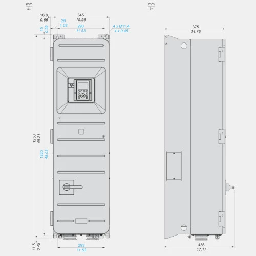 Falownik ATV650D55N4E Schneider Electric dedykowany do współpracy z trójfazowymi silnikami o obciążeniu do 87A. Przemiennik częstotliwości ATV650D55N4E o mocy 45kW przy obciążaniu lekkim oraz 55 kW przy obciążeniu ciężkim współpracuje zarówno w silnikami asynchronicznymi jaki i synchronicznymi. Przetwornik ATV650 w wykonaniu z odłącznikiem zasilany jest napięciem 380...480 VAC o częstotliwości 47,5...63 Hz. Prąd wyjściowy falownika ATV650D55N4E wynosi odpowiednio 87A ND oraz 106 HD, zaś częstotliwość wyjściowa 500Hz. Komunikacja w falowniku ATV600 Schneider odbywa się po: Modbus TCP, Ethernet. 3-fazowy falownik ATV600 ATV650D55N4E dysponuje 8 wejściami binarnymi, 3 wejściami analogowymi, 2 wyjściami analogowymi oraz 3 wyjściami przekaźnikowymi. Dodatkowo dysponuje wejściem bezpieczeństwa STO. Kompaktowa obudowa o stopniu ochrony IP55 przystosowana jest do montażu naściennego. Wymiary przetwornika ATV650D55N4E wynoszą: 345x1250x436 mm, a jego waga to 89,3kg.