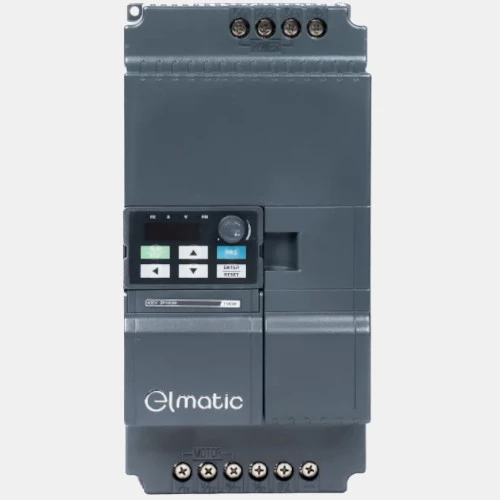 Falownik ED2400-05R5G-C Elmatic dedykowany do współpracy z trójfazowymi asynchronicznymi silnikami indukcyjnymi o mocy 5,5 kW. Przemiennik częstotliwości 5,5 kW ED2000 zasilany jest napięciem 3x400 VAC o częstotliwości 50-60 Hz. Producent podaje częstotliwość wyjściową na poziomie 0,1...320 Hz. Prąd wejściowy tego przetwornika szacowany jest na poziomie 15A, natomiast prąd wyjściowy oscyluje wokół 13A. Inverter ED2400-05R5G-C dysponuje następującymi trybami sterowania: bezczujnikowe, wektorowe, skalarne U/f. Falownik Elmatic ED2400-05R5G-C został wyposażony w prosty PLC, posiada 6 wejść binarnych w tym 1 szybkie 100 kHz, 1 wejście analogowe prądowo-napięciowe, 1 wyjście przekaźnikowe. Przemiennik posiada również wbudowany filtr EMC. Komunikacja w tym przetworniku odbywa się protokołem Modbus RTU po RS485. Producent zaleca stosowanie rezystora hamowania o mocy 800 W i rezystancji 90 Ohm. W przypadku 3-fazowego falownika ED2400-05R5G-C Elmatic proponuje wykorzystanie stycznika 18A, różnicówkę 20 A oraz przewód o przekroju 2,5mm2. Obudowa przetwornika ED2400-05R5G-C została wykonana z tworzywa i cechuje się stopniem ochrony IP20 oraz montażem naściennym. Wymiary 3-fazowego falownika 5,5 kW ED2000 wynoszą 100x183x143 mm.