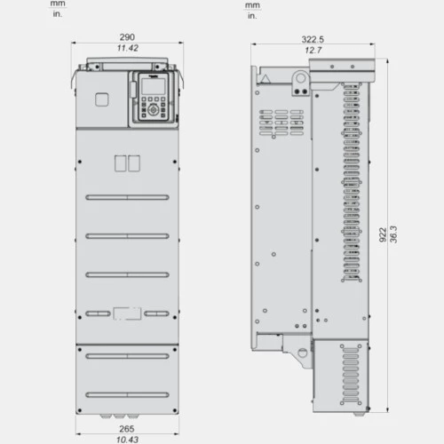 Falownik ATV630D55N4 Schneider Electric dedykowany do współpracy z trójfazowymi silnikami o obciążeniu do 106A. Przemiennik częstotliwości ATV630D55N4 o mocy 55kW przy obciążaniu lekkim oraz 45 kW przy obciążeniu ciężkim współpracuje zarówno w silnikami asynchronicznymi jaki i synchronicznymi. Przetwornik ATV630 w wykonaniu z odłącznikiem zasilany jest napięciem 380...480 VAC o częstotliwości 47,5...63 Hz. Prąd wyjściowy falownika ATV630D55N4 wynosi odpowiednio 106A ND oraz 88 HD, zaś częstotliwość wyjściowa 500Hz. Komunikacja w falowniku ATV600 Schneider odbywa się po: Modbus TCP, Ethernet lub Modbus szeregowy. 3-fazowy falownik ATV600 ATV630D55N4 dysponuje 8 wejściami binarnymi, 3 wejściami analogowymi, 2 wyjściami analogowymi oraz 3 wyjściami przekaźnikowymi. Dodatkowo dysponuje wejściem bezpieczeństwa STO. Kompaktowa obudowa o stopniu ochrony IP55 przystosowana jest do montażu naściennego. Wymiary przetwornika ATV630D55N4 wynoszą: 290x922x323 mm, a jego waga to 56,5kg.
