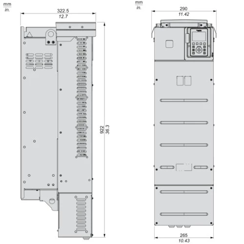 Falownik Altivar Process ATV930D90N4C Schneider Electric przeznaczony do pracy z trójfazowymi silnikami asynchronicznymi i synchronicznymi. 3-fazowy falownik ATV930D90N4C o mocy 90 kW przy obciążeniu lekkim i 75 kW przy obciążeniu ciężkim. Prąd wyjściowy wynosi odpowiednio 173 A przy lekkim obciążeniu i 145A przy obciążeniu ciężkim. Częstotliwość wyjściowa dla falownika Altivar Process ATV900 wynosi 599 Hz. Inwerter ATV930D90N4C dysponuje 10 wejściami binarnymi, 2 wyjściami binarnymi, 3 wejściami analogowymi, 2 wyjściami analogowymi oraz 3 wyjściami przekaźnikowymi. Ponadto ATV900 dysponuje wejściem bezpieczeństwa STO. Komunikacja w falowniku ATV930D90N4C odbywa się protokołem Ethernet/IP i Modbus TCP. Przemiennik częstotliwości w wersji standardowej ATV930D90N4C został wyposażony w filtr EMC. Falownik ATV930D90N4C posiada obudowę przystosowaną do montażu naściennego pionowego i stopniu ochrony IP21. Wymiary falownika ATV930 90kW wynoszą: 290 x 922 x 325,5 mm i wadze 58,5 kg.