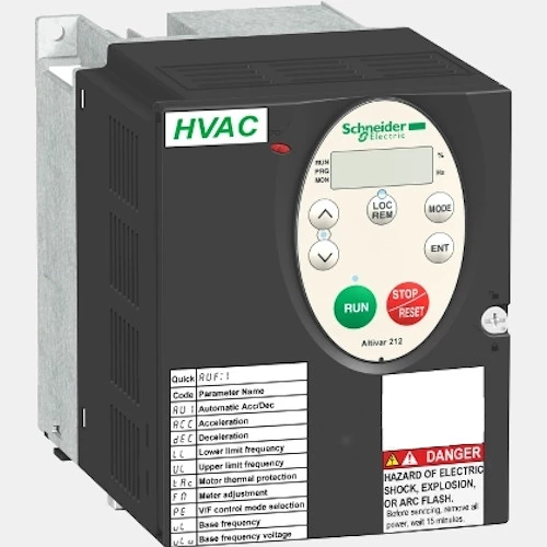 3-fazowy falownik ATV212H075N4 sterowany wektorowo marki Schneider Electric o mocy 0,75 kW. Przemiennik Altivar 212 zasilany jest napięciem 3 x 400V AC o częstotliwości 50/60 Hz. Pobór prądu przemiennika częstotliwości wynosi 1,7 A. Falownik wyposażony jest w 3 wejścia cyfrowe, 2 wejścia analogowe, 2 wyjścia przekaźnikowe oraz 1 wyjście analogowe. Ponadto producent daje możliwość rozbudowy inwertera o dodatkowe karty wejść/wyjść oraz komunikacyjne. Falownik ATV212 Schneider Electric posiada wbudowany filtr EMC, radiator oraz regulator PID. ATV212H075N4 Schneider Electric dysponuje komunikacja Modbus RTU po RS-485. Trójfazowy falownik ATV212H075N4 konfigurowany jest przy pomocy oprogramowania SoMove. Wektorowe falowniki ATV212 dysponują 50 funkcjami oraz 7 predefiniowanymi prędkościami. Inwerter został wyposażony w obudowę o wymiarach: 107 x 143 x 150 mm oraz stopniu ochrony IP21. Waga urządzenia to 2kg. Producent deklaruje możliwość pracy falownika w temperaturze od -10 do +50 stopni Celsjusza. Falowniki Altivar 212 dedykowane są do aplikacji HVAC.