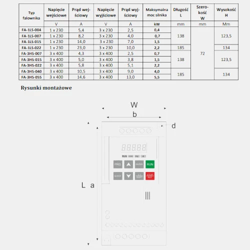 1-fazowy falownik FA-1LS-007 producenta F&F o mocy 0,7 kW pobiera prąd w wysokości 8,2 A. Inwerter sterowany jest w sposób bezczujnikowy wektorowy i dedykowany jest do asynchronicznych silników trójfazowych. Przemiennik częstotliwości F&F zasilany jest napięciem 230V AC. Falownik 1-fazowy posiada 5 wejść binarnych, 1 wejście analogowe 0...10V, 0..20mA, 1 wyjście analogowe 0...10V, 0...20mA oraz 1 wyjście przekaźnikowe. Inverter FA-1LS/FA-3HS ma wbudowany port RS485 z komunikacją Modbus RTU, regulator PID oraz funkcjonalny panel sterujący z możliwością ustawienia blokady PIN. Za pomocą PLC posiada możliwość zaprogramowania do 16 kroków. Przemiennik FA-1LS-007 charakteryzuje się obudową w bardzo kompaktowych wymiarach 138 x 72 x 123,5 mm. Falownik FA-1LS-007 przystosowany jest do montażu na szynę DIN i wymaga umiejscowienia w szafie sterowniczej. Z powodzeniem pracuje w temperaturze oscylującej w przedziale od -10...40 °C.