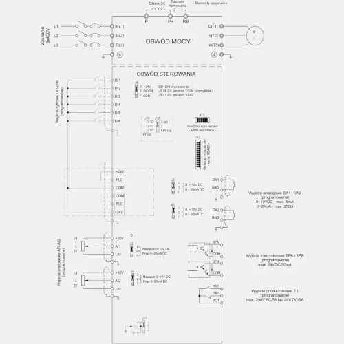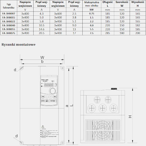 3-fazowy falownik FA-3HX055 producenta F&F o mocy 5,5 kW pobiera prąd w wysokości 14,6 A. Inwerter sterowany jest w sposób bezczujnikowy wektorowy i dedykowany jest do asynchronicznych silników trójfazowych. Przemiennik częstotliwości F&F zasilany jest napięciem 400V AC pracuje na bazie wydajnego procesora 32 bitowego DSR. Falownik 3-fazowy posiada 6 wejść binarnych, 2 wejścia analogowe 0...10V, 0..20mA, 2 wyjścia analogowe 0...10V, 0...20mA, 2 wyjścia tranzystorowe oraz 1 wyjście przekaźnikowe. Inverter FA-1LX/FA-3HX ma wbudowany port RS485 z komunikacją Modbus RTU oraz funkcjonalny panel sterujący z możliwością ustawienia blokady PIN. Za pomocą PLC posiada możliwość zaprogramowania do 7 kroków. Przemiennik FA-3HX055 charakteryzuje się obudową w bardzo kompaktowych wymiarach 185 x 150 x 220 mm. Falownik FA-3HX055 przystosowany jest do montażu na szynę DIN i wymaga umiejscowienia w szafie sterowniczej. Z powodzeniem pracuje w temperaturze oscylującej w przedziale od -10...40 °C.
