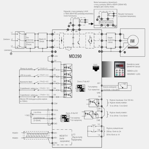 3-fazowy falownik MD290T75G/90P-INT producenta Inovance z serii MD290 o mocy 75/90 kW i poborze prądu 139/167 A. Inwerter sterowany jest w sposób skalarny. Przemiennik częstotliwości MD290 Inovance został wyposażony w 5 wejść binarnych, w tym 1 szybkie, 2 wejścia analogowe, w tym jedno napięciowe 0...10V, natomiast drugie prądowe lub napięciowe 0...20mA, 0...10V, 1 wyjście analogowe 0...10V lub 0...20mA oraz 1 wyjście przekaźnikowe i 1 tranzystorowe. Inovance zastosował w urządzeniu czoper hamowania oraz hamowanie prądem stałym DC. Ponadto do urządzenia istnieje możliwość dołączenia zewnętrznego rezystora hamowania. Co więcej przetwornik MD290 Inovance na płytkach PCB pokryty jest dodatkowa powłoką ochronną w celu niezawodnej pracy w trudnym środowisku. Falownik MD290T75G/90P-INT został wykonany w wymiarach 554 x 338 x 315 mm.