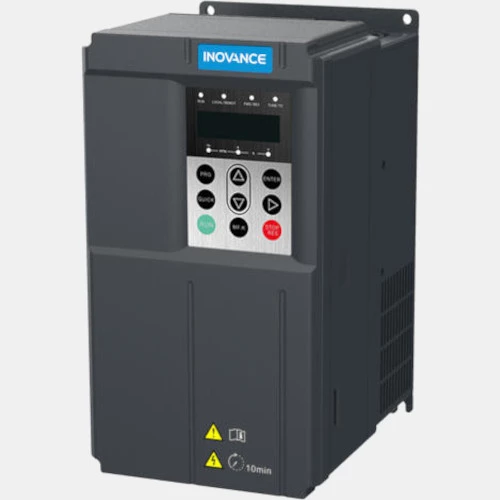 3-fazowy falownik MD500T11GB-INT producenta Inovance pochodzący z serii MD500 o mocy 11 kW i poborze prądu 32,2 A. Inwerter sterowany jest w sposób wektorowy lub skalarny. Producent wyposażył przemiennik MD500T11GB-INT w 5 wejść NPN/PNP w tym także 1 szybkie, 2 wejścia analogowe jedno 0...10V, a drugie 0...10V lub 0...20mA, 1 wyjście przekaźnikowe NO/NC, 1 wyjście tranzystorowe, 1 wyjście analogowe 0...10V lub 0...20mA oraz 1 wyjście impulsowe. Ponadto falownik MD500 można rozbudować przy pomocy karty wejść oraz wyjść. Opcjonalnie można również podłączyć karty komunikacyjne Modbus RTU, EtherCAT, Profibus DP, Profinet, CANopen i CANlink. MD500T11GB-INT posiada wbudowany moduł hamowania, hamowanie prądem stałym DC oraz możliwość podłączenia rezystora hamowania.. Co więcej 3-fazowy przetwornik Inovance na płytkach PCB pokryty jest dodatkowa powłoką ochronną w celu niezawodnej pracy w bardzo trudnym środowisku klasy 3C2 oraz 3S2. Falownik MD500T11GB-INT został wykonany w wymiarach 250 x 140 x 170 mm i wadze 3 kg. Przetwornik MD500T11GB-INT zaprojektowany został do pracy w temperaturze -10...50 °C. Trójfazowy falownik Inovance programowany jest przy pomocy darmowego narzędzia InoDriveShop.