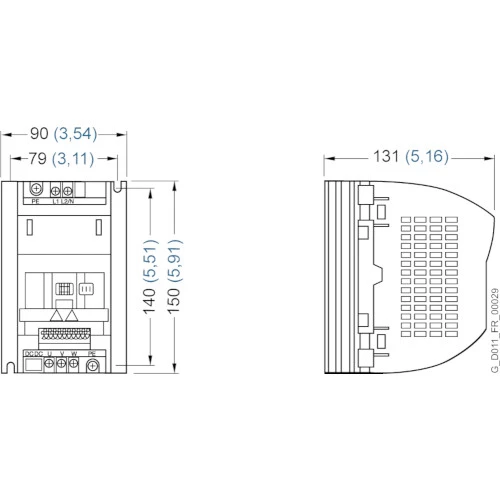 1-fazowy falownik produkcji Siemens z filtrem EMC o mocy 750 W. Sinamics G110 6SL3211-0AB17-5BA1 zasilany jest napięciem mieszczącym się w przedziale 170...264V AC o częstotliwości 47...63 Hz. Pobór prądu przemiennika częstotliwości wynosi 10 A. Falownik Sinamics G110 wyposażony jest w 1 wyjście binarne, 3 wejścia binarne, 1 wejście analogowe napięciowe 0...10V. Wejście analogowe może zostać użyte jako wejście cyfrowe. Przemiennik 6SL3211-0AB17-5BA1 dysponuje pasywnym chłodzeniem. Wymiary falownika Siemens to: 150 x 90 x 131 mm. Waga urządzenia wynosi 0,9kg.
