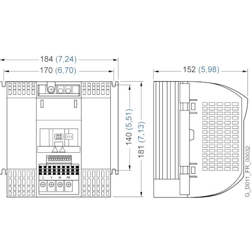 1-fazowy falownik produkcji Siemens bez filtra o mocy 3000 W. Sinamics G110 6SL3211-0AB23-0UA1 zasilany jest napięciem mieszczącym się w przedziale 170...264V AC o częstotliwości 47...63 Hz. Pobór prądu przemiennika częstotliwości wynosi 32 A. Falownik Sinamics G110 wyposażony jest w 1 wyjście binarne, 3 wejścia binarne, 1 wejście analogowe napięciowe 0...10V. Wejście analogowe może zostać użyte jako wejście cyfrowe. Przemiennik 6SL3211-0AB23-0UA1 dysponuje aktywnym chłodzeniem. Wymiary falownika Siemens to: 184 x 181 x 152 mm. Waga urządzenia wynosi 2,1kg.