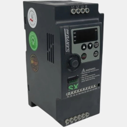 3-fazowy falownik SX1000-110G-4 producenta Sanyu pochodzący z serii SX1000 o mocy 110 kW oraz maksymalnej częstotliwości 400 Hz. Przetwornik został wyposażony w sterownik PLC do prostych aplikacji. W falowniku producent zastosował 4 wejścia binarne, 2 wejścia analogowe 0...10V lub 0/4...20mA oraz 1 wyjście przekaźnikowe programowalne 3A. Do komunikacji został zabudowany port RS-485. Przemiennik częstotliwości SX 1000 Sanyu sterowany jest w sposób skalarny w pętli zamkniętej i można w nim zaprogramować do 16 stałych prędkości. Dodatkowo posiada funkcje zaprogramowania 2 czasów. 3-fazowy falownik dysponuje także wbudowanym fabrycznie wyświetlaczem LED z funkcyjnymi przyciskami oraz potencjometrem. Co więcej do inwerter SX1000-110G-4 ma możliwość opcjonalnego podpięcia klawiatury zewnętrznej. Atutem przemiennika SX 1000 Sanyu są zabudowane funkcje ochronne, a także blokada przez osobami nieupoważnionymi. Falownik Sanyu posiada stopień ochrony IP20 i powinien pracować wyłącznie w pomieszczeniach, w dalekiej odległości od kurzu, substancji oleistych, wody, a także promieni słonecznych. Przedział temperaturowy dla pracy falownika wynosi -10...40 stopni Celsjusza. Obudowa przetwornika SX1000-110G-4 Sanyu został wykonana w wymiarach 630 x 275 x 310 mm i wadze 37,5 kg. Falownik SX1000 Sanyu SX1000-110G-4 z powodzeniem sprawdzi się w aplikacjach spożywczych, transportowych, a także HVAC.