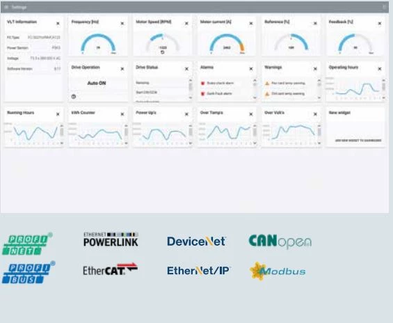 Inwertery Danfoss wyposażone są w 6 wejść binarnych gdzie 2 z nich mogą służyć jako wyjścia cyfrowe oraz 2 mogą być stosowane do wejść impulsowych z logiką PNP lub NPN, 2 wejścia analogowe 0...10V, 0...20, 4...20 mA, 1 wyjście analogowe 0...20, 4...20 mA oraz 2 wyjścia przekaźnikowe. Dysponuje także portem RS485, protokołem FC, Modbus RTU, N2 Metasys, FLN Apogee. Uzupełniająco posiada możliwość rozbudowy o karty komunikacyjne oraz wejść/wyjść.