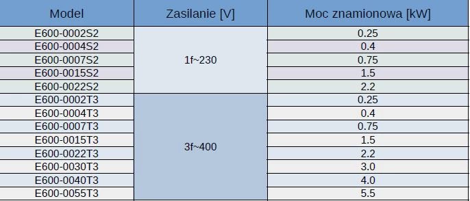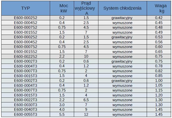 Skalarne falowniki E600 Eura przeznaczone do pracy z trójfazowymi silnikami indukcyjnymi. Eura Drive oferuje falowniki w wykonaniu jednofazowym o mocy od 0,25 kW do 2,2kW oraz w wykonaniu trójfazowym o zakresie mocy 0,75 kW - 5,5 kW. W standardzie te przetworniki zostały wyposażone w 4 wejścia cyfrowe, 1 wejście analogowe napięciowo-prądowe, 1 wyjście cyfrowe, 1 wyjście przekaźnikowe oraz 1 wyjście analogowe napięciowo-prądowe. Dodatkowo urządzenia posiadają wbudowany filtr EMC oraz regulator PID. Komunikacja odbywa się poprzez RS485 protokołem Modbus. Kompaktowa obudowa falowników została przystosowana zarówno do montażu na szynie DIN, jak i bezpośrednio na płycie montażowej. Falowniki Eura z tej grupy charakteryzują się automatycznym lub dowolnie zdefiniowanym (w zakresie do 20 kroków) wzmocnieniem momentu. Kolejną funkcją jest hamowanie prądem DC dla częstotliwości 0,2...50 Hz w czasie 0...30s. Kolejnym atutem E600 jest opcja ustawienia na wejściach binarnych do 15 stałych prędkości oraz automatyczna praca do 8 kroków. W zależności od modelu falowniki system chłodzenia jest wymuszony lub grawitacyjny.