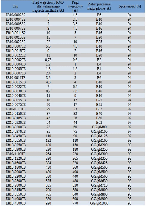 Wektorowe falowniki Eura Drives E810 ze względu na rodzaj zasilania dzielą się na 3 wykonania. Przemienniki o zasilaniu 1x230 VAC dostępne są w zakresie mocy 200W - 2,2 kW, natomiast przetworniki o zasilaniu 3x 400 VAC oferowane są od 0,55 kW do 110 kW. Trójfazowe falowniki E810 o zasilaniu 3x230 VAC dostępne są o mocy od 750 W do 2,2kW. Częstotliwość wyjściowa deklarowana jest na poziomie 0-650 Hz a napięcie na wyjściu 3F 0-100% napięcia zasilania. W standardzie falowniki Eura z tej serii mają 6/8 wejść cyfrowych, 1/2 wyjścia cyfrowe, 1 wyjście przekaźnikowe, 2 wejścia analogowe prądowe oraz 1 wyjście analogowe prądowe oraz 1 wyjście analogowe napięciowe. Komunikacja odbywa się protokołem Modbus RS485. Dodatkowo wszystkie falowniki E810 zostały w zabudowany regulator PID. Przetworniki sterowane są w sposób wektorowy lub skalarny.