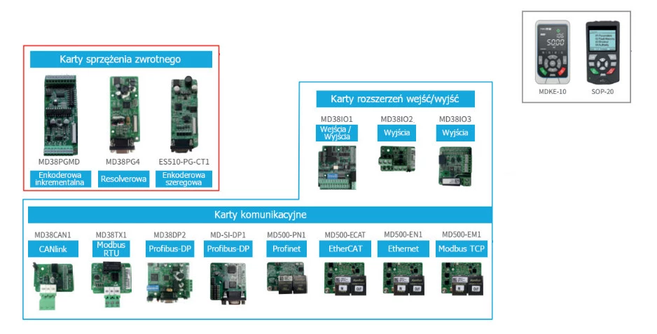 Inovance oferuje szereg dedykowanych akcesoriów do falownik ze swojej oferty. Dostępne są między innymi karty komunikacyjne, filtry EMC, klawiatury zdalne czy moduły wejść/wyjść. Ponadto w ofercie dostępne są potencjometry czy rezystory hamowania. Rodzaj kart rozszerzeń uzależniony jest od wybranego falowniki. W przypadku falowników MD520 dostępne są również moduły sprzężenia zwrotnego.