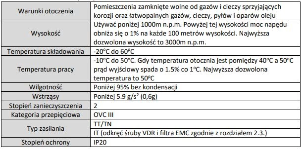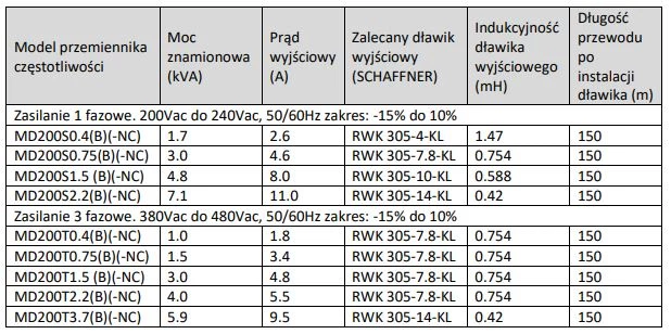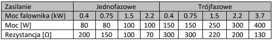 Poniżej tabela z zalecanymi rezystorami hamowania do falowników MD200 Inovance