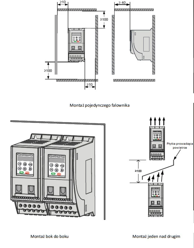 Przemienniki częstotliwości serii MD200 przystosowane są do montażu w szafach sterowniczych zgodnych z normami CE. Montaż powinien zapewnić odpowiednie odprowadzenie ciepła. Zaleca się instalacje falowników poza bezpośrednim światłem słonecznym, w wilgotności nie przekraczającej 95%. Zaleca się nie instalowanie falownika MD200 w pobliżu urządzeń mechanicznych wytwarzających wysokie wibracje/wstrząsy.