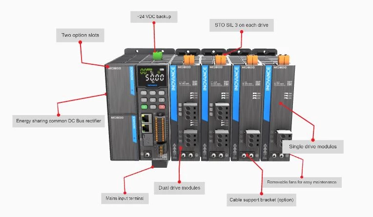 Falowniki MD800 Inovance o zakresie mocy od 0,2 kW do 7,5 kW. W standardzie zostały wyposażone w komunikację CANopen, Modbus RTU oraz CANlink. Dodatkowo można rozbudować możliwości falownika MD800 o komunikację EtherCAT, Modbus TCP, EtheNet/IP czy ProfiNet. Wszystkie modułowe falowniki MD800 Inovance dysponują 4 wejściami cyfrowymi, 4 wejściami/wyjściami binarnymi, 2 wejściami analogowymi oraz 1 wyjściem przekaźnikowym, z możliwością rozbudowy o dodatkowe punktu IO za pomocą kart rozszerzeń. Wektorowe falowniki MD800 współpracują zarówno z trójfazowymi silnikami asynchronicznymi jak i synchronicznymi. Wszystkie napędy Inovance z tej serii posiadają wejście bezpieczeństwa STO, stopniem ochrony IP40. Oferowane są napędy MD800 w wykonaniu jednoosiowym oraz dwuosiowym. Częstotliwość wyjściowy oscyluje wokół 590 Hz. Inovance umożliwia umieszczenie na jednym urządzeniu od 1 do 8 osi napędowych.