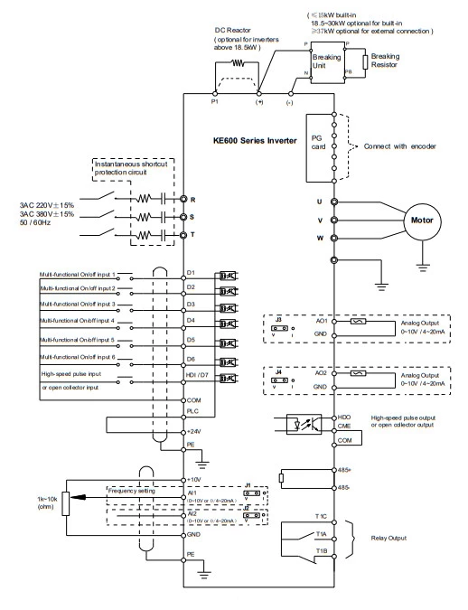 Trójfazowe falowniki KE300 dostępne są na 3 rodzaje zasilania. Charakteryzują się częstotliwością wyjściową na poziomie 3000Hz przy sterowaniu skalarnym oraz 300Hz przy sterowaniu wektorowym pętli zamkniętej. W standardzie falowniki KE600 zostały wyposażone w 7 wejść cyfrowych, 2 wejścia analogowe prądowo-napięciowe, wyjście przekaźnikowe, wyjście tranzystorowe oraz 2 wyjścia analogowe prądowo-napięciowe. Dodatkowo producent daje możliwość rozbudowy możliwości falownika z wykorzystaniem kart rozszerzeń wejść/wyjść. Komunikacja odbywa się po RS485 protokołem Modbus-RTU. Producent zadbał o zaopatrzenie falowników KE600 w szereg funkcjonalnych opcji, takich jak: autotuning, automatyczna regulacja napięcia, szybka odpowiedź dynamiczna czy zaawansowane funkcje pozycjonowania w przypadku wykonania KE600B. Dodatkowo urządzenia te posiadają funkcję sterowania wieloma silnikami.