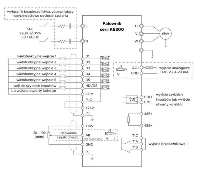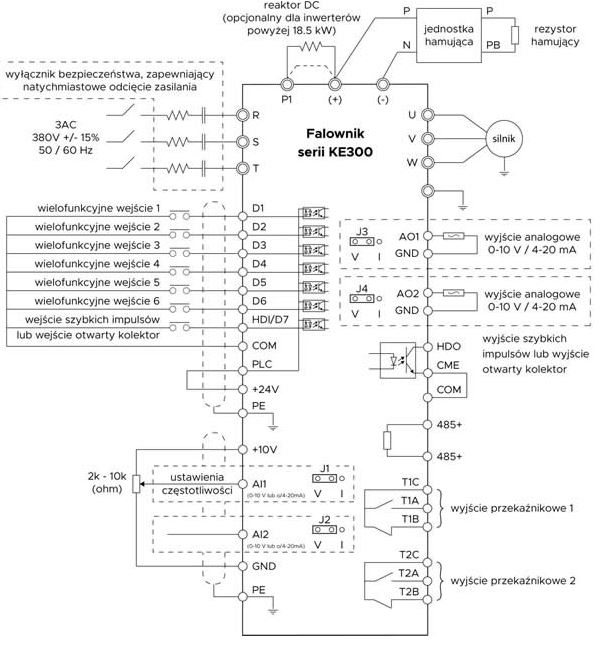Falowniki KE300 MICNO Drive występują w szerokim zakresie mocy od 0,4 kW do 630 kW. Falowniki jednofazowe o napięciu 1x230V AC istnieją w mocach od 0,4 kW do 2,2 kW z kolei pozostałe moce to falowniki 3-fazowe 3 x 400 V AC. Przemienniki częstotliwości z serii KE300 wyposażone zostały w 8 wejść programowalnych, w tym jedno wejście dedykowane jest do szybkich impulsów. Ponadto dysponuje 2 wejściami analogowymi -10...10 V lub 0...20/4...20mA, 2 wyjściami analogowymi 0...10V lub 0...20/4...20mA, 2 wyjściami przekaźnikowymi oraz 1 wyjściem tranzystorowym. MICNO zaprojektował w inwerterach port RS485, który dedykowany jest do obsługi z komunikacją Modbus RTU. Falowniki KE300 charakteryzują się także posiadaniem podstawowych funkcji PLC 16 kroków. Demontowany panel sterującym wraz z wyświetlaczem LCD pozwala na wyświetlanie wybranych danych, dodatkowo wielofunkcyjna klawiatura pozwala na szybkie i płynne konfigurowanie falownika. Także wysokim atutem jest wbudowany potencjometr do płynnej regulacji. Dodatkowo wbudowana funkcja autotuningu pozwala na precyzyjne zidentyfikowanie parametrów silnika.