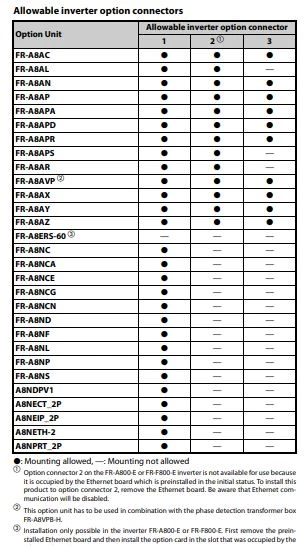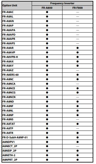 Falowniki FR-A o zasilaniu 3x230 VAC dostępne są w zakresie mocy od 0,2 kW do 132 kW, natomiast invertery FR-A800 o zasilaniu 3x400 VAC oferowane są w zakresie mocy od 200 W do 630 KW. Przetworniki z tej serii zostały wyposażone w 12 wejść cyfrowych, 2 wejścia analogowe, 2 wyjścia przekaźnikowe, 2 wyjścia analogowe oraz wyjścia tranzystorowe. Dodatkowo w zależności od modelu dostępny jest port RS485, Ethernet, złącze USB typu B ora typu A, a także złącze PU. Przetworniki FR-A przystosowane są do pracy w zakresie temperatur od -10 do + 50 stopni Celsjusza. Invertery FR-A800-E o zwiększonym stopniu ochrony wynoszącym IP55 mogą bezpiecznie pracować do 40 st. C. W zależności od wykonania trójfazowe falowniki Mitsubishi FR-800A dostępne są w wykonaniu z zabudowaną funkcją CC-link, filtrem przeciwzakłóceniowym klasy C2 lub C3. Dodatkowo oferowane są także modele falowników z oddzielnym prostownikiem.