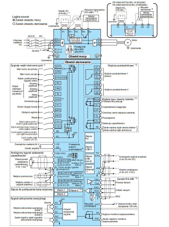 Falowniki FR-A800 Mitsubishi Electric dedykowane do współpracy z trójfazowymi silnikami. W ofercie dostępne są wektorowe falowniki Mitsubishi Electric o zakresie mocy od 0,2 kW do 630 kW. Mitsubishi w serii FR oferuje przemienniki częstotliwości o zasilaniu 3-fazowym w wykonaniu 3x230 VAC oraz 3x400 VAC.