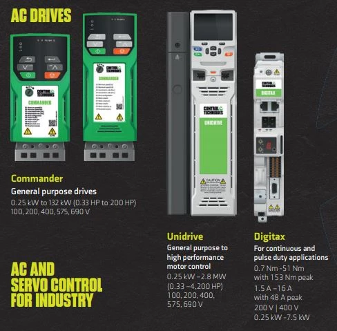 Falowniki marki Control Techniques - Nidec dedykowane do aplikacji napędowych. Przetworniki przeznaczone są do sterowania trójfazowymi silnikami. W ofercie dostępne falowniki o szerokim zakresie mocy do 2,8MW. Control Techniques oferuje przetworniki z zabudowanym wejściem bezpieczeństwa STO czy modułem hamowania.