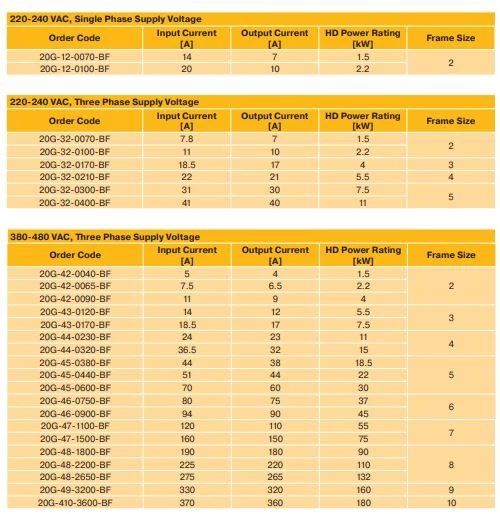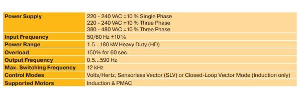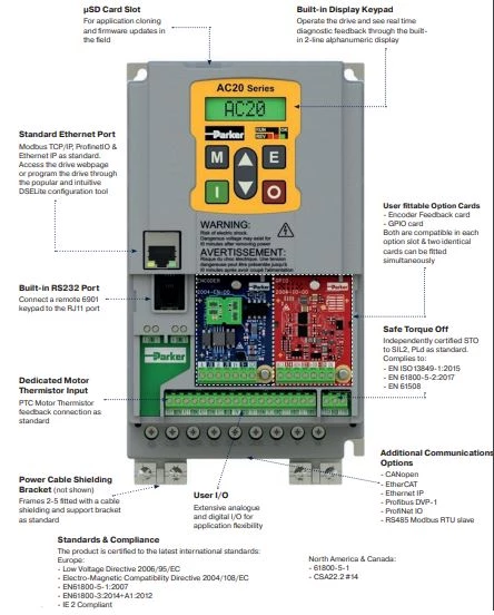 Przetworniki częstotliwości Parker serii AC20 dostępne są o zakresie mocy od 1,5 kW do 180 kW. Producent oferuje falowniki w trzech wykonaniach zasilania: 1x230 VAC, 3x230 VAC oraz 3x400 VAC. W standardzie invertery te dysponują wejściem bezpieczeństwa STO w kategorii SIL2 oraz komunikacją Ethernet, Modbus TCP/IP. Producent podaje przeciążalność falowników na poziomie 150% w czasie 1minuty, a częstotliwość wyjściową na poziomie 599Hz. W zależności od modelu falownik AC20 dysponuje 8/10 wejściami binarnymi, 3 wejściami analogowymi, 3 wyjściami analogowymi, 3 wyjściami cyfrowymi oraz 2 wyjściami przekaźnikowymi.