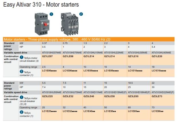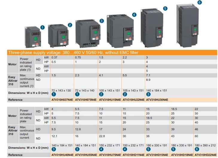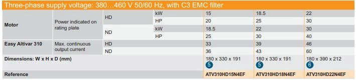 Przemienniki częstotliwości Easy Altivar 310 dostępne są w zakresie mocy od 0,37 do 22kW. Wszystkie invertery Schneider Electric z tej serii zasilane są napięciem 3x400VAC. Schneider Electric oferuje przetworniki Altivar Easy 310 w wykonaniu z zabudowanym radiatorem, filtrem EMC lub bez filtra. Komunikacja w tych urządzeniach odbywa się protokołem Modbus RTU po RS485. Kompaktowe obudowy 3-fazowych falowników przystosowane są do montażu w pionie z maksymalnym odchyleniu wynoszącym 10 stopni. Częstotliwość wyjściowa podana jest przez producenta na zakres od 0,5 do 400 Hz, zaś znamionowa częstotliwość wyjściowa 4kHz.