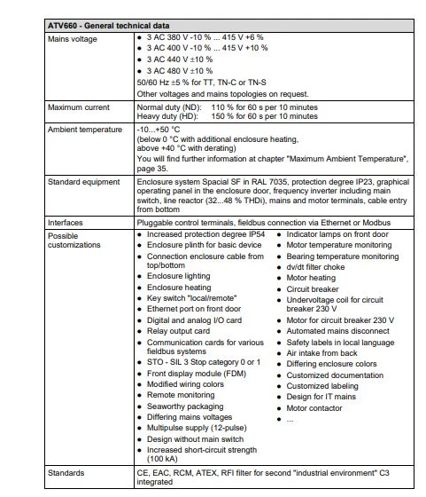 Trójfazowe falowniki ATV600 w standardzie zostały wyposażone w obsługę protokołu Ethernet oraz Modbus. Dodatkowo producent daje możliwość rozbudowy o Ethernet IP, Modbus TCP, CANopen, Profnet, Profibucs DP V1, EtherCAT, DeviceNet, PowerLink oraz BACnet MS/TP. Dostępne są modele o stopniu ochrony wynoszącym odpowiednio: IP21, IP53 lub IP55. W zależności od modelu obudowa falownika przystosowana jest do montażu naściennego lub podłogowego. Producent podaje zakres częstotliwości wyjściowej dla przetworników Altivar 600 na poziomie 0,1...500 Hz. Falowniki ATV600 zostały wyposażone w wejście bezpieczeństwa STO, 3 wejścia analogowe, 6 wejść binarnych, 2 wyjścia analogowe oraz 3 wyjścia przekaźnikowe