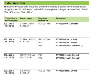 Falowniki Altivar Procesor 600 dostępne są w zakresie mocy od 750 W do 2600 kW. Schneider oferuje przetworniki z tej serii z zakresem napięcia 200, 400, 690 V. Trójfazowe falowniki ATV600 współpracują z silnikami indukcyjnymi, PM, reluktancyjnymi, IE2, IE3 oraz IE4. Schneider wyposażył invertery z te serii w następujące funkcje: