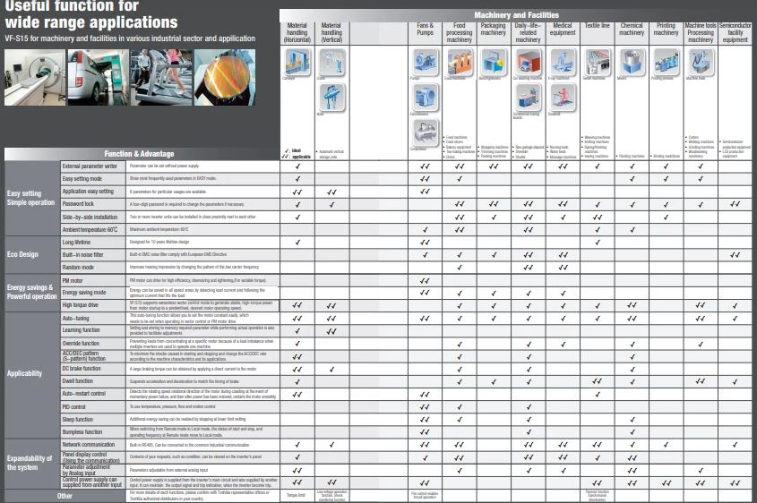 Falowniki marka Toshiba znalazły szerokie zastosowanie wielu aplikacjach napędowych. Wykorzystywane są niemal we wszystkich gałęziach przemysłu. Z powodzeniem sprawdzają się w aplikacjach dźwigowych, transporterach, przenośnikach. W branży spożywczej stosowane są przy równego typu dozownikach, rozlewaczkach, dystrybutorach czy maszynach pakujących. Innym przykładem zastosowań inverterów Toshiba są mieszalniki czy miksery przemysłowe. Również w korowarkach czy kruszarkach sprawdzają się te przetworniki.