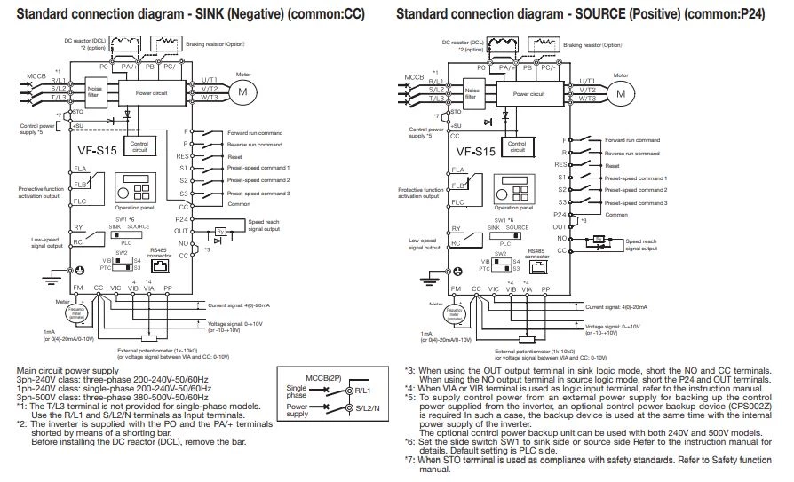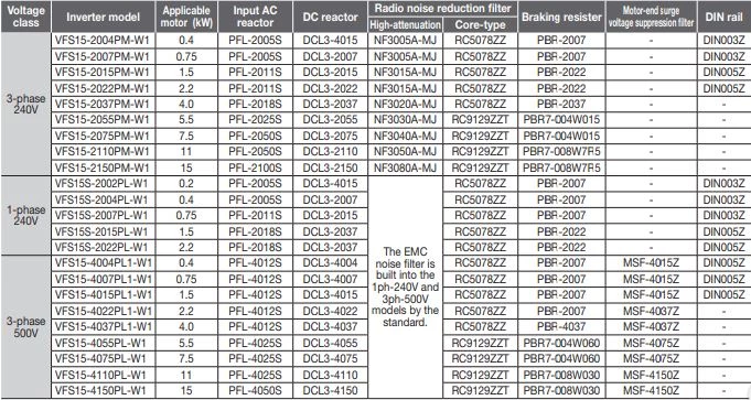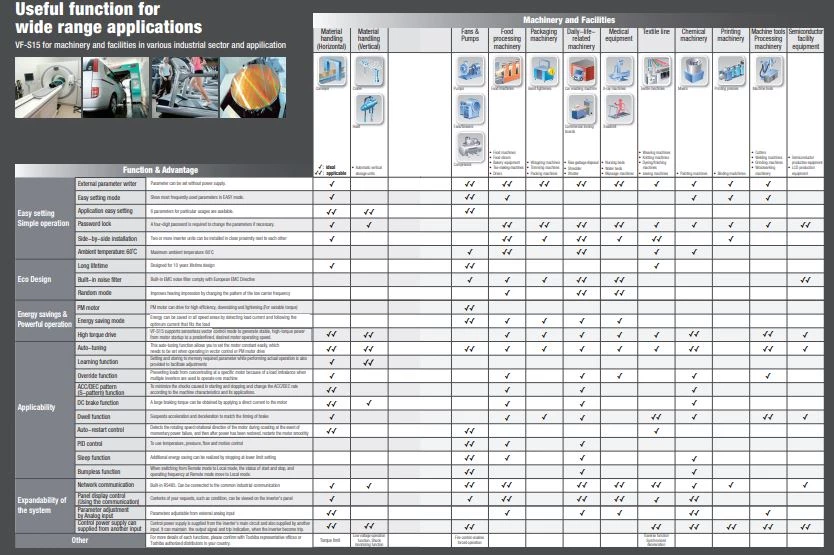 Toshiba oferuje przetworniki częstotliwości w wykonaniu na zasilanie 1x230 VAC, 3x230 VAC, 3x400 VAC. Jednofazowe falowniki Toshiba VFS15 dostępne są w zakresie mocy od 200 W do 2,2 kW, natomiast 3-fazowe falowniki o mocy od 400 W do 15 kW. Invertery te dysponują 6 wejściami cyfrowymi, 3 wejściami analogowymi, 3 wyjściami cyfrowymi, 1 wyjściem analogowym oraz 2 wyjściami przekaźnikowymi. Komunikacja odbywa się protokołem Modbus RTU po RS485. Dodatkowo zostały wyposażone w zabudowany filtr przeciwzakłóceniowy oraz regulator PID. Wektorowe przemienniki VFS15 Toshiba charakteryzują się częstotliwością wyjściową do 500Hz. Producent deklaruje możliwość pracy urządzeń w zakresie temperatur od -10 do +60 stopni Celsjusza. Bezpieczne magazynowanie Toshiba VF-S15 zaś odbywa się w temperaturze -25...70 stopni C. Atutem jest opcja montażu falowników jeden obok drugiego, co pozwala na zaoszczędzenie miejsca w szafie sterowniczej.