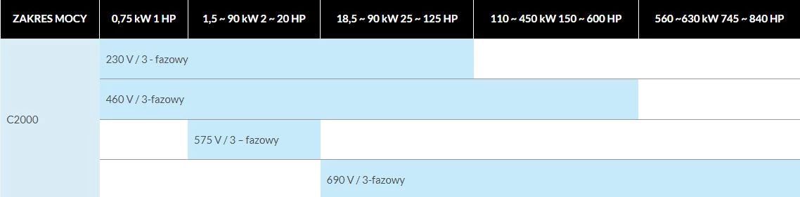 Falowniki C2000 stosowane są w bardziej złożonych aplikacjach. Przemienniki częstotliwości Delta Electronics C2000 wyposażone zostały we wbudowany sterownik PLC 10k kroków. Sterowanie jest skalarne, wektorowe bezczujnikowe oraz wektorowe w pętli zamkniętej. Dostępne tryby pracy w falownikach C2000: prędkościowy, momentowy, pozycyjny. Przeciążalność dla 230V/460V wynosi: